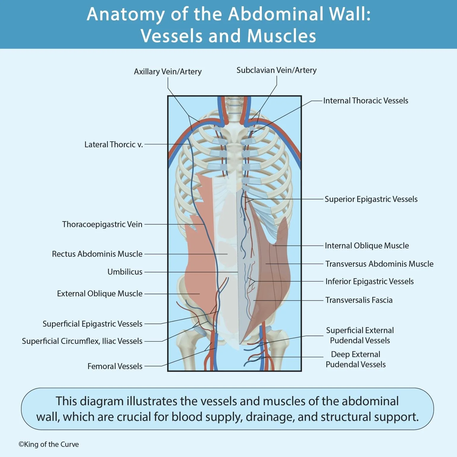 Proper blood supply and venous return are critical to abdominal wall function and healing post-surgery. Highlighted vessels include: