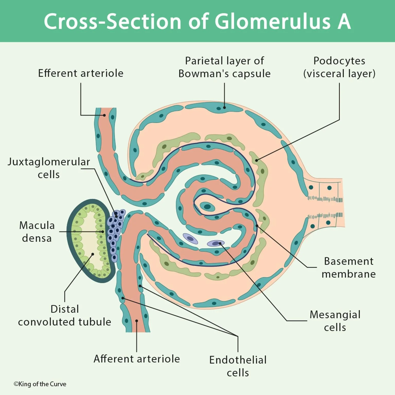 The glomerulus is a critical structure within the kidney's nephron, responsible for the initial step of filtering blood to form urine. The diagram above represents a cross-section of Glomerulus A, highlighting the intricate arrangement of cells and layers that work together to perform filtration effectively.