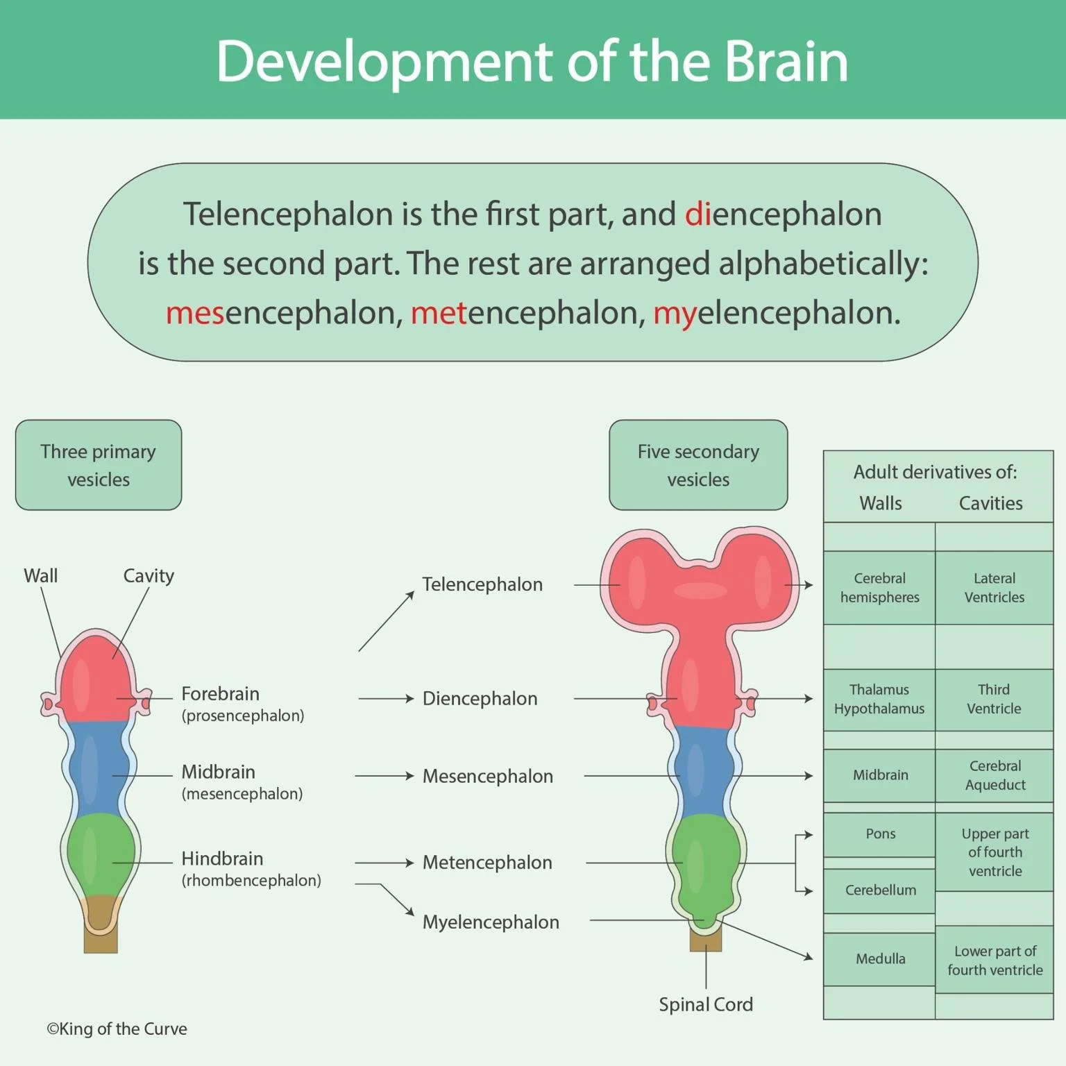 💡 Mnemonic: After Telencephalon and Diencephalon, the rest can be remembered alphabetically: Mesencephalon → Metencephalon → Myelencephalon.