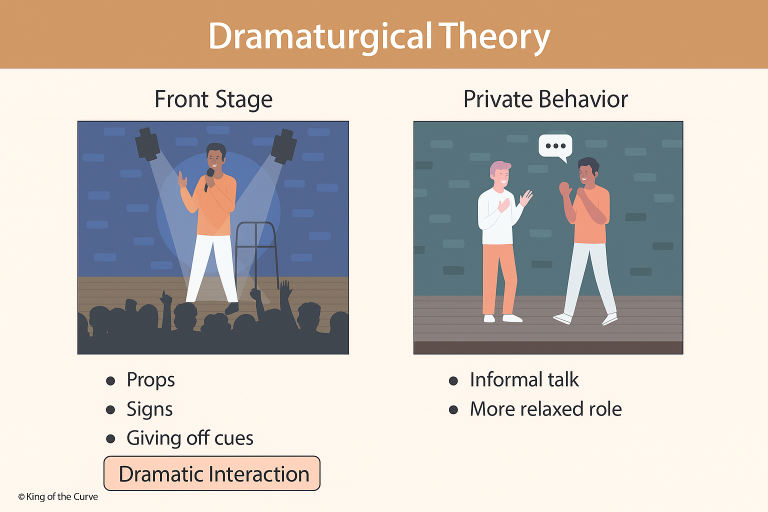 Dramaturgical Theory, proposed by sociologist Erving Goffman, compares everyday social interaction to a theatrical performance. According to this theory, we all play roles and manage impressions as if we’re actors performing on a stage.