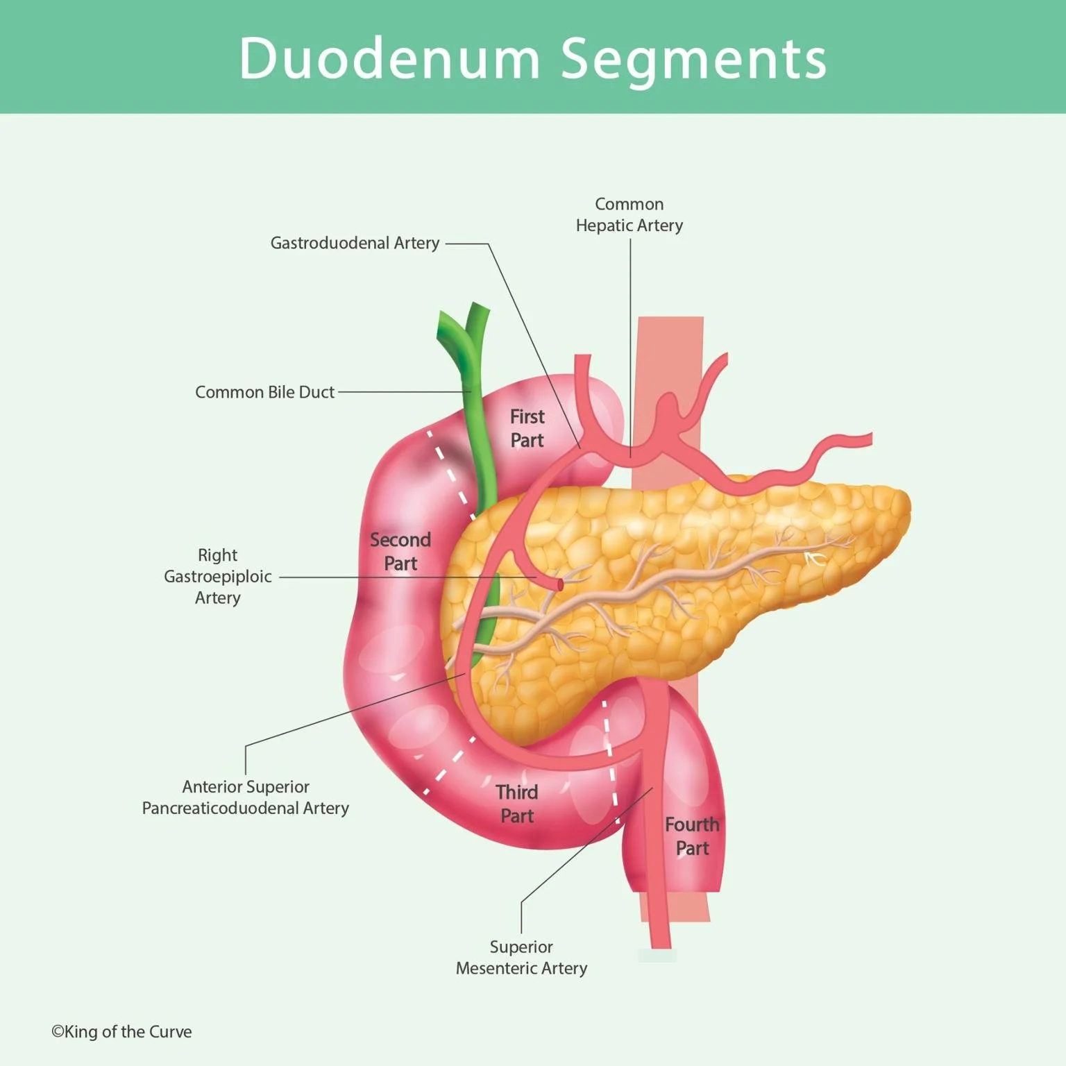 The duodenum is the first section of the small intestine and serves as the meeting point for food from the stomach, bile from the gallbladder, and enzymes from the pancreas. Itβs a key player in digestion and nutrient breakdown. The duodenum is divided into four parts, each with distinct anatomy, blood supply, and clinical importance.