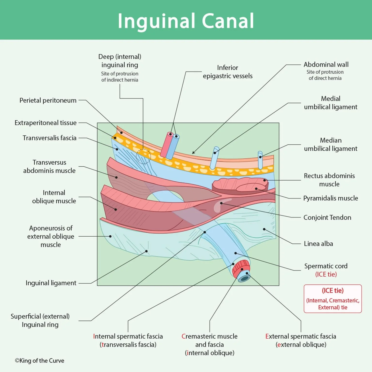 Contained within are several important elements, including the spermatic cord, ilioinguinal nerve, and connective tissue layers derived from the abdominal wall. To simplify the complex anatomy, students often remember the fascial coverings of the spermatic cord with the mnemonic “ICE tie”:
