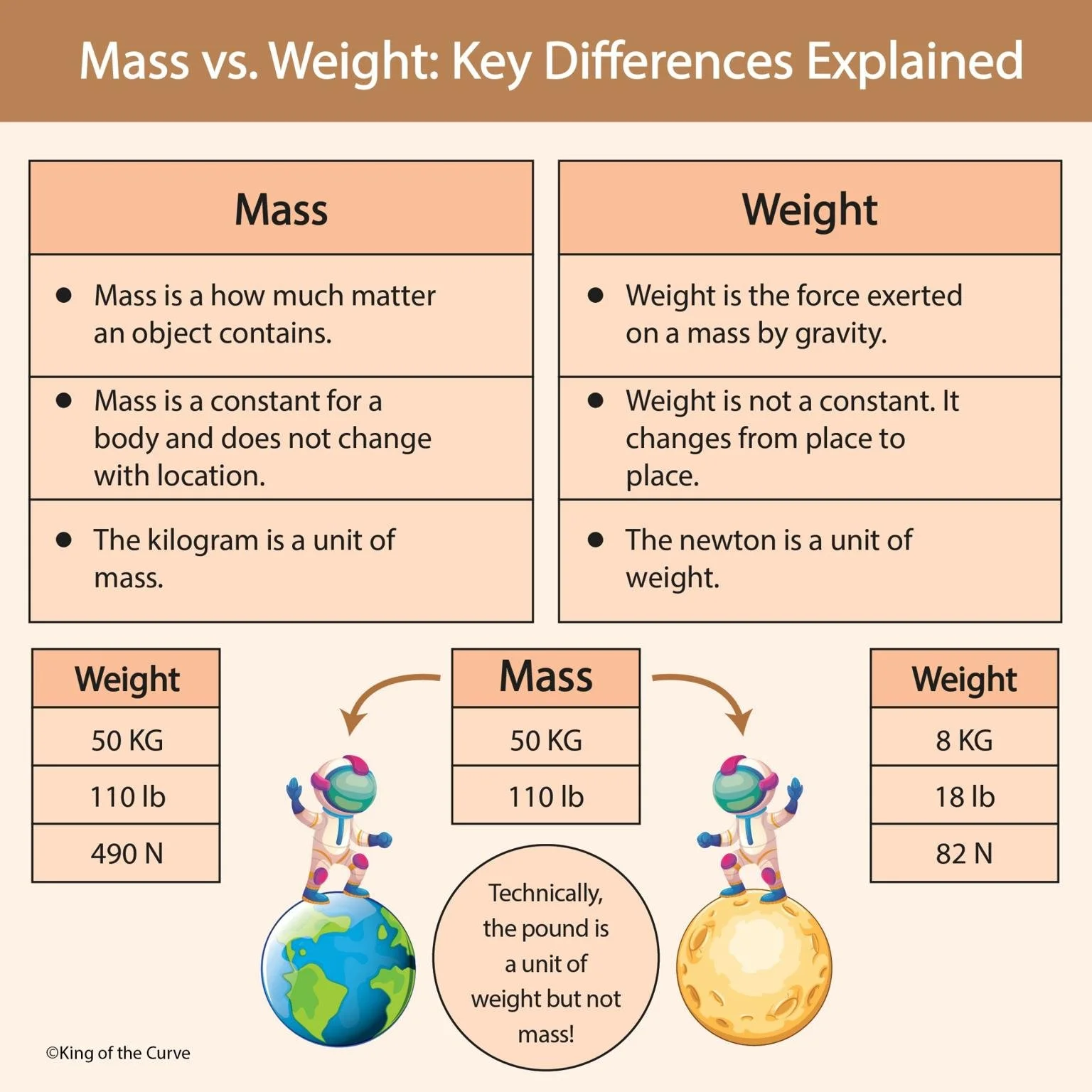 To visualize the difference, imagine an astronaut with a mass of 50 kg. On Earth, their weight is about 490 N, while on the Moon โ where gravity is weaker โ their weight drops to around 82 N. However, their mass remains the same: 50 kg.