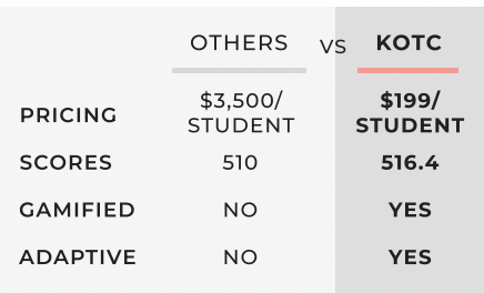 This infographic compares King of the Curve (KOTC) to traditional MCAT prep tools, showing that KOTC is more affordable, yields higher scores, and includes gamified and adaptive learning features.