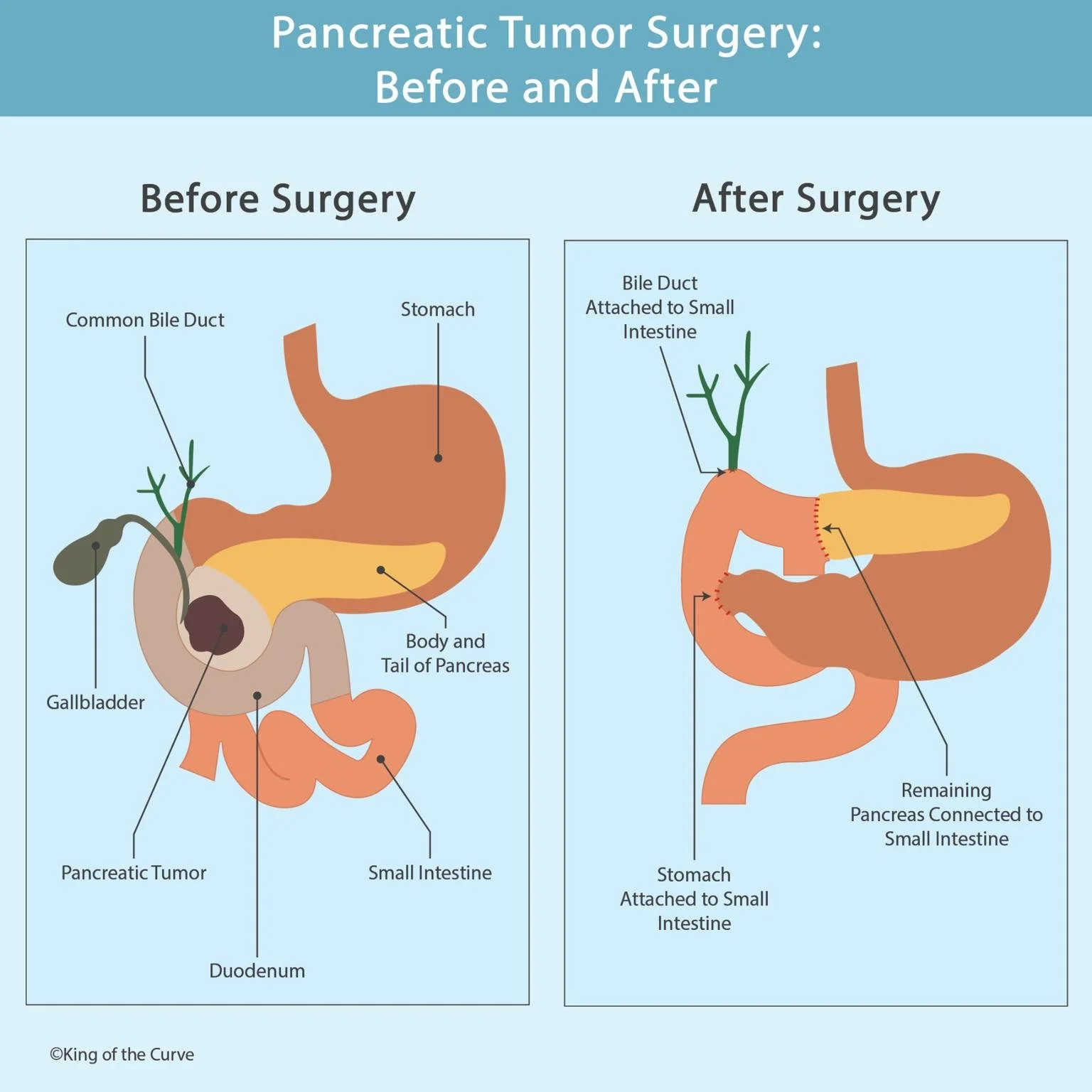 The “before surgery” illustration shows the normal anatomical arrangement, with the pancreatic tumor obstructing nearby ducts.