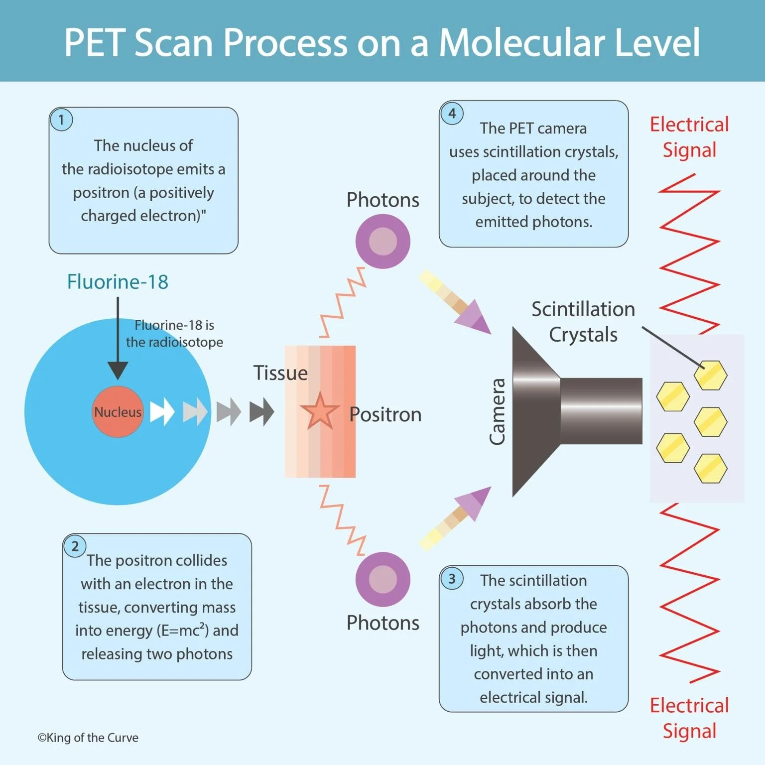 The process begins with the radioisotope, such as Fluorine-18, which is incorporated into biologically active molecules like glucose. When introduced into the body, the nucleus of the radioisotope emits a positron — a positively charged electron. This emission marks the start of the molecular-level imaging process.